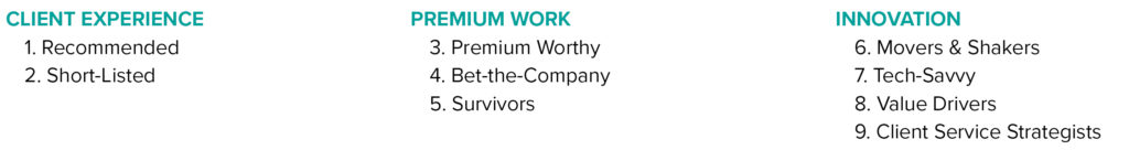 While conducting interviews between February 2016 and January 2018, the BTI research team examined how the nine following elements associated with a strong brand influenced the client’s decision to select, consider, and hire a law firm.