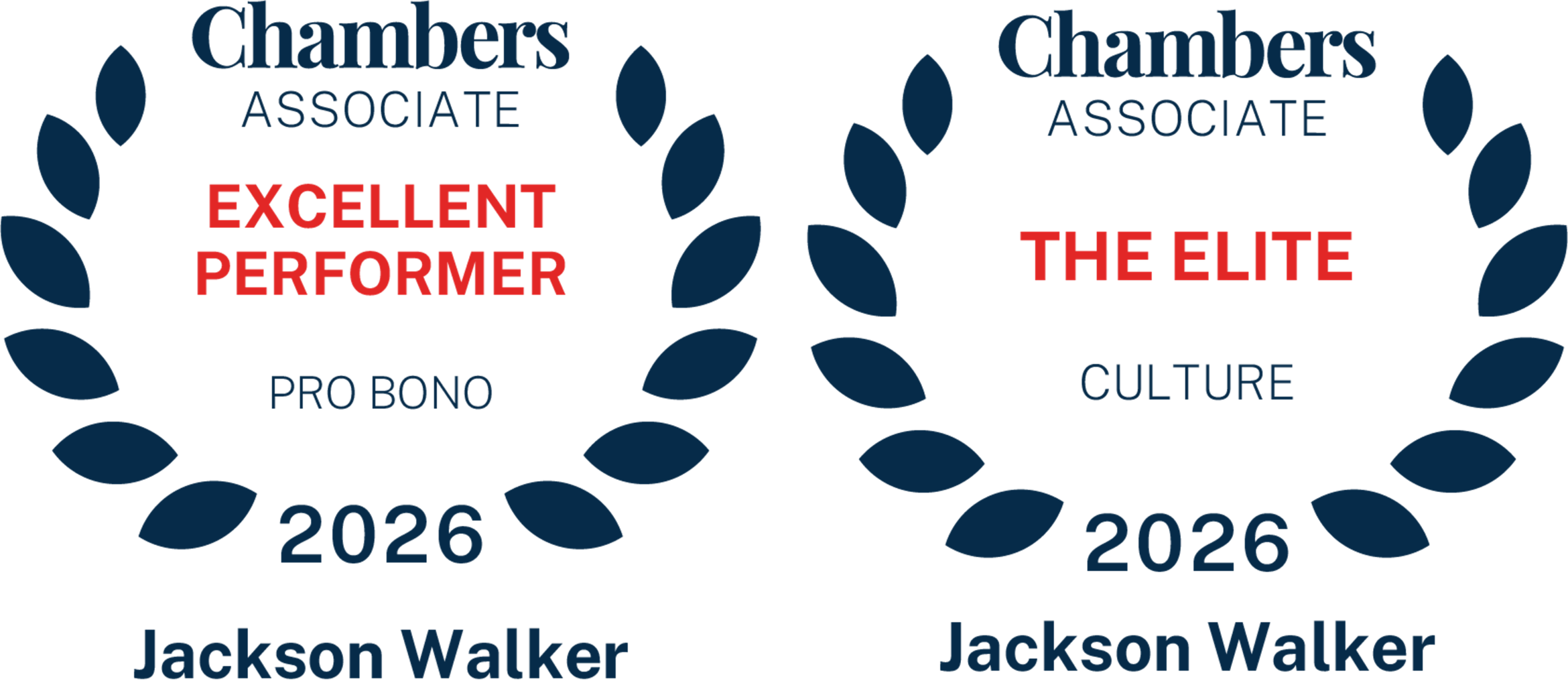 Jackson Walker earned top honors in the Chambers Associate Satisfaction Surveys 2026, achieving Elite status in the “Best Firms for Culture” category and ranking as an Excellent Performer for “Best Firms for Pro Bono.” View our profile on Chambers Associate »