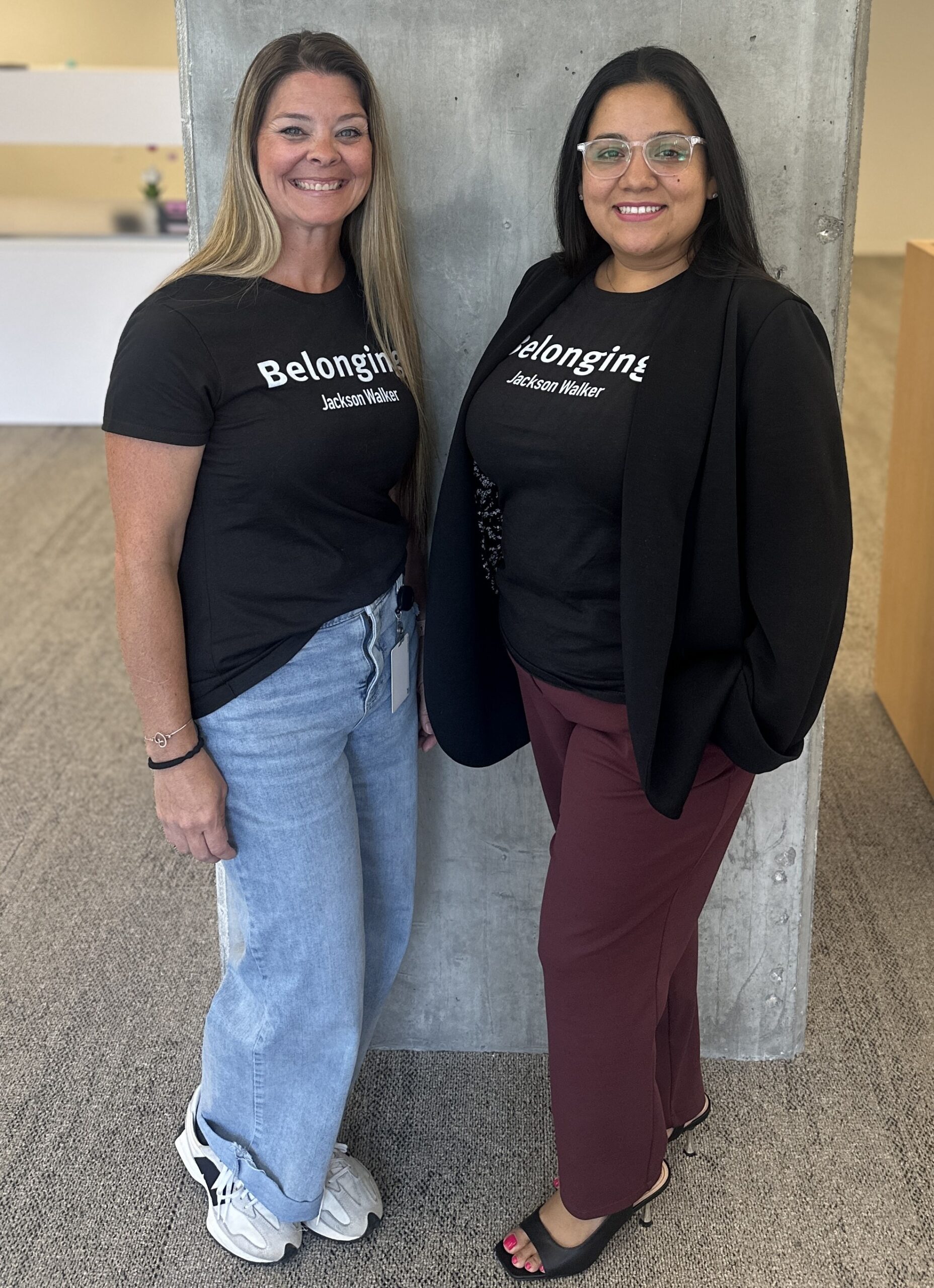 Belonging at Jackson Walker: Ashlie Hein and Rebecca Villanueva proudly wear JW’s “Belonging” tee, embodying our firm’s commitment to creating a workplace where every voice is heard, every story matters, and everyone feels at home.