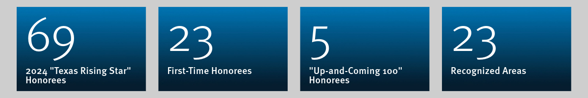 The firm proudly congratulates the 69 attorneys listed below who were honored, organized by office and including the first year they were rated as “Rising Stars” as well as their recognized practice area. Notably, five of our attorneys were named among the “Up-and-Coming 100: Texas Rising Stars” list.